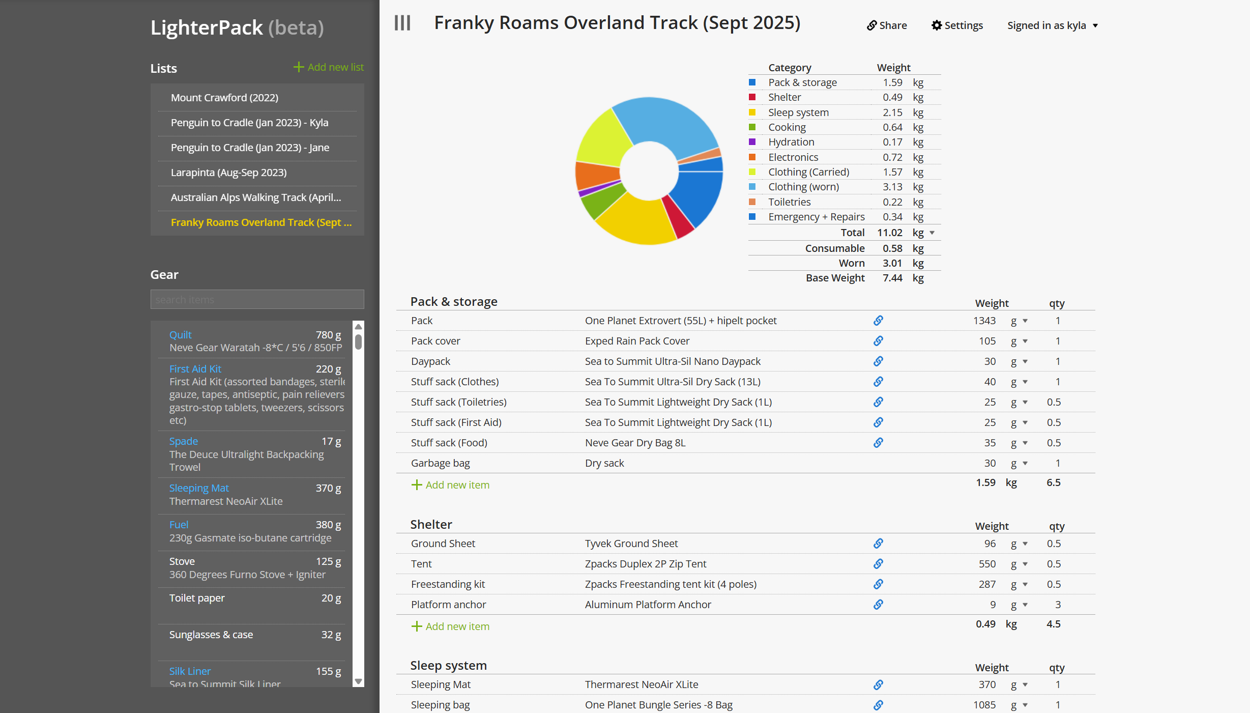 We use Lighterpack, a free web-based tool, to weigh and record every item before a hike. It’s one of the best hiking gear hacks to avoid “pack creep”—that sneaky habit of adding unnecessary, and unweighted items. Once your gear is logged, you can easily create packing lists for future hikes. Check out our sample lists: Australian Alps Walking Track and Overland Track.