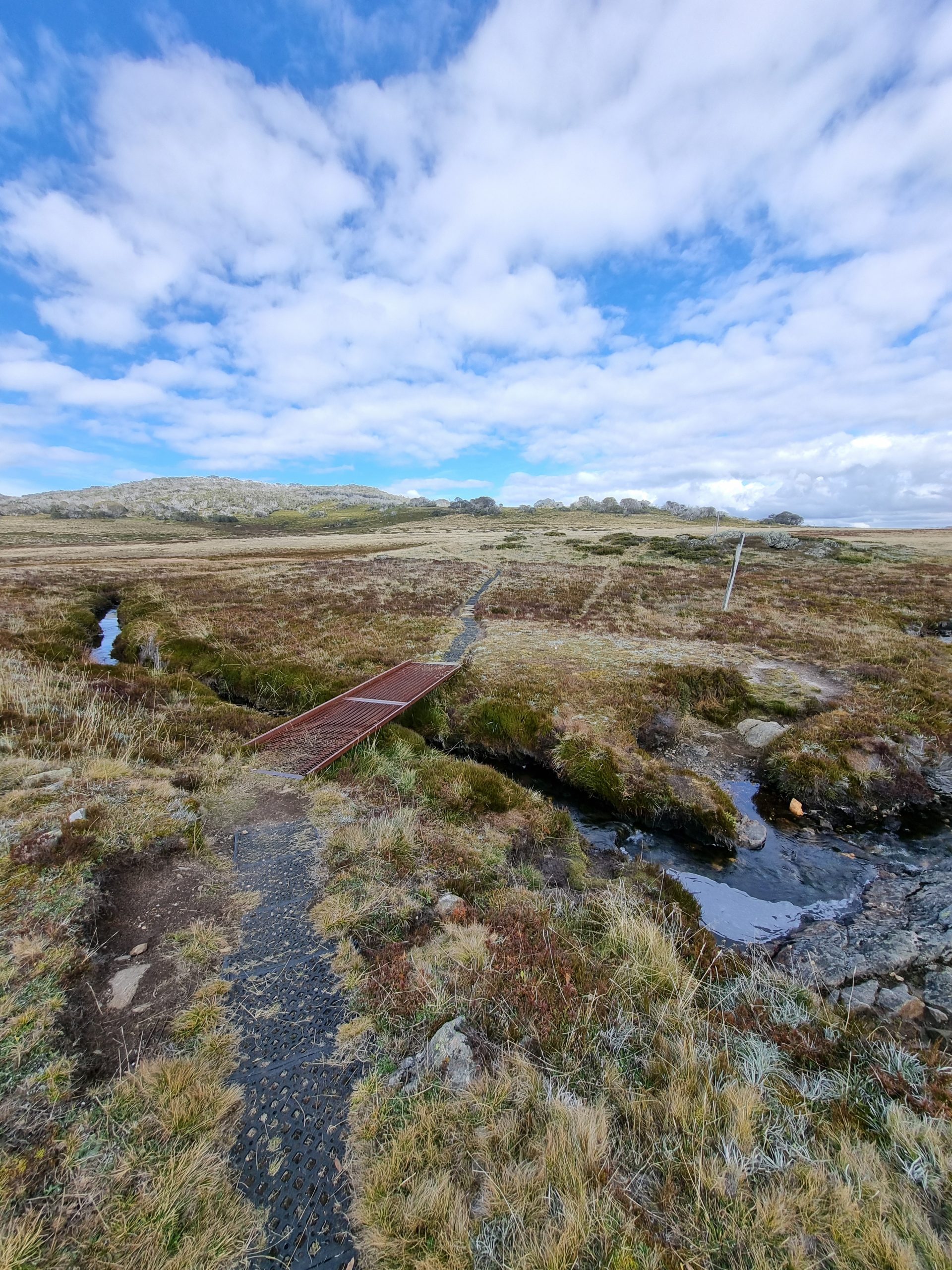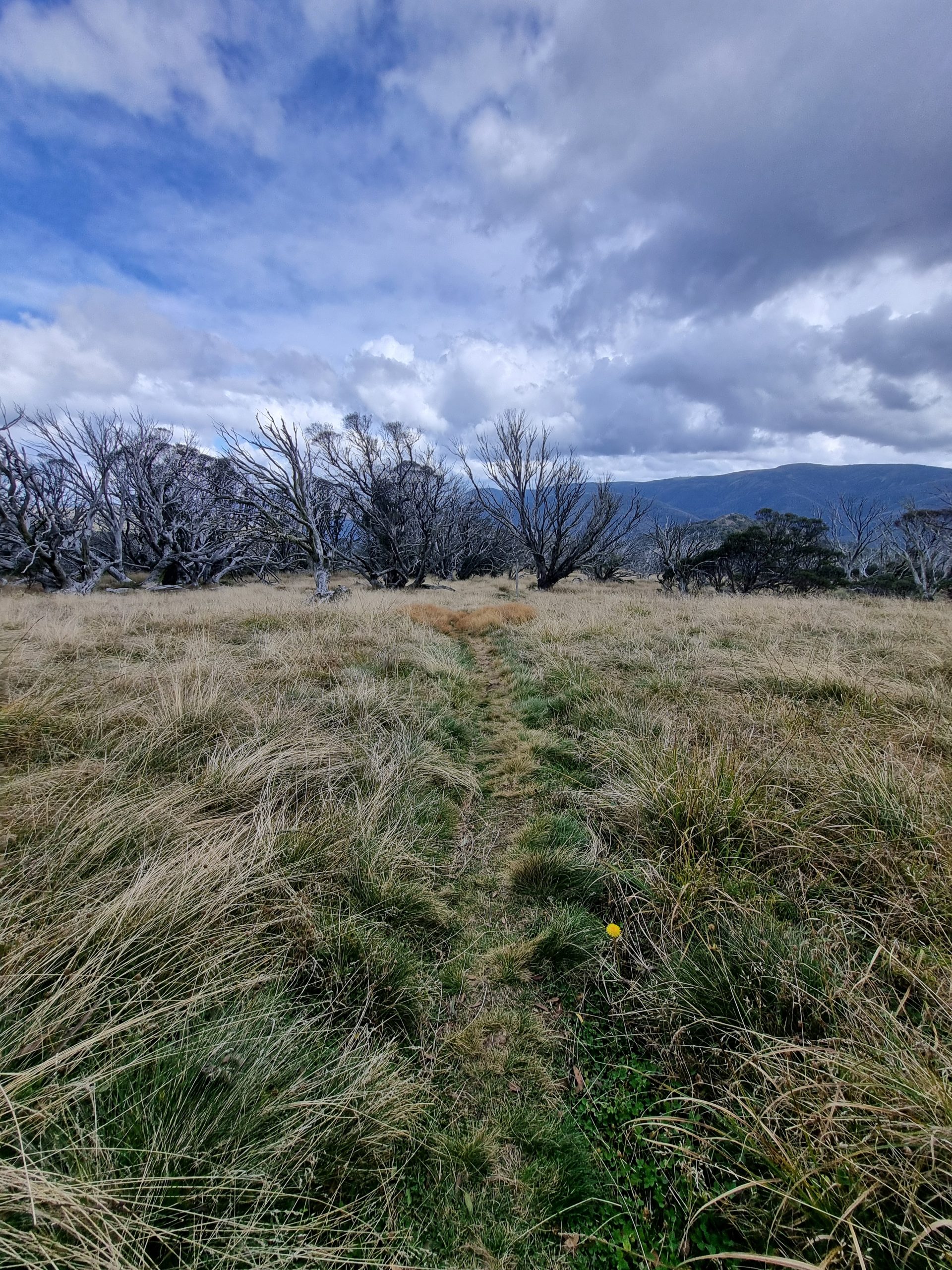 I started the day’s trek at 7.30am and at around 1800m altitude, with few trees surrounding me on the rolling Bogong Plains.