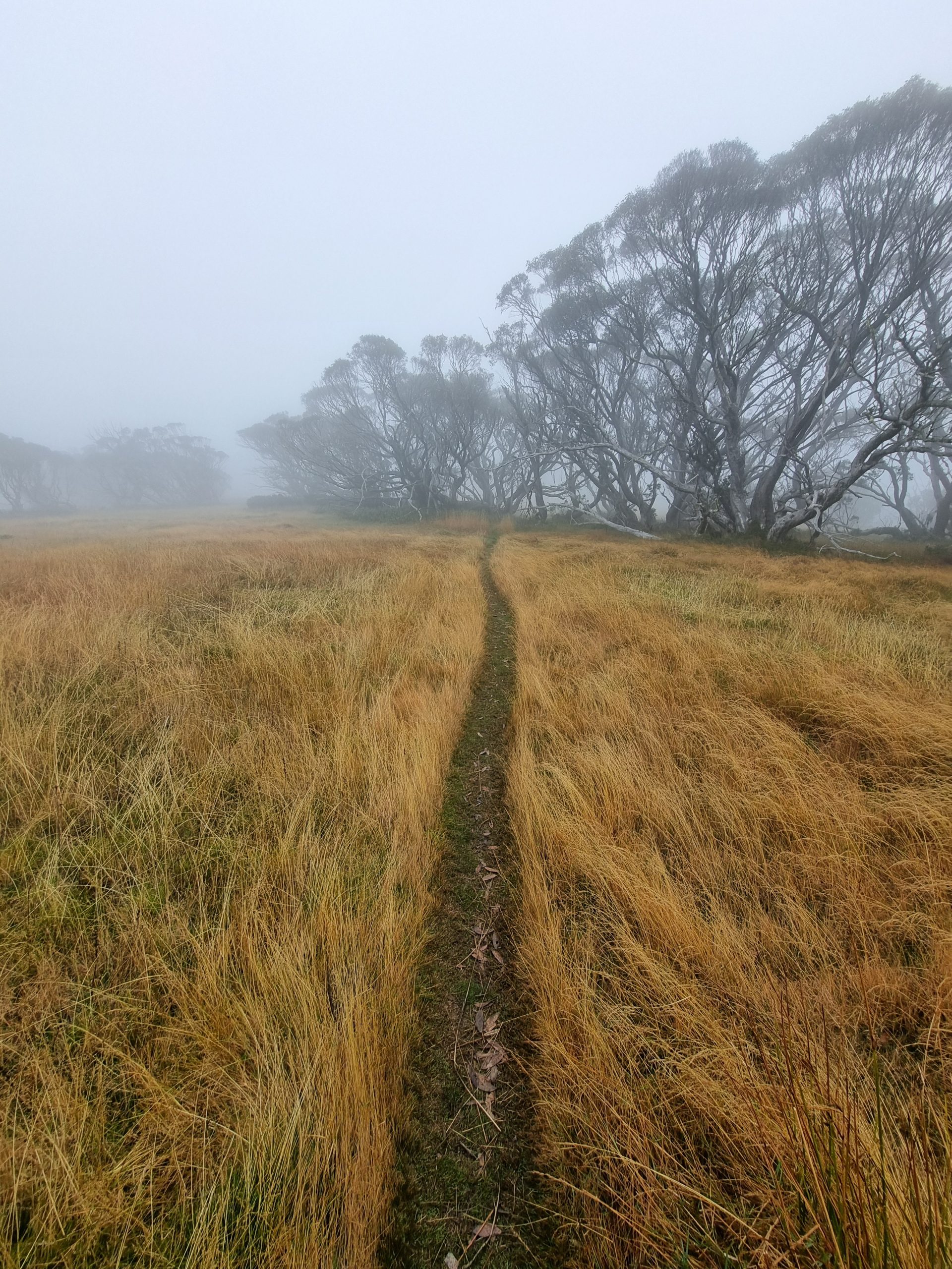 The trail was surrounded by golden wheat-like grass and gangly snow gums with moss clinging to their limbs.