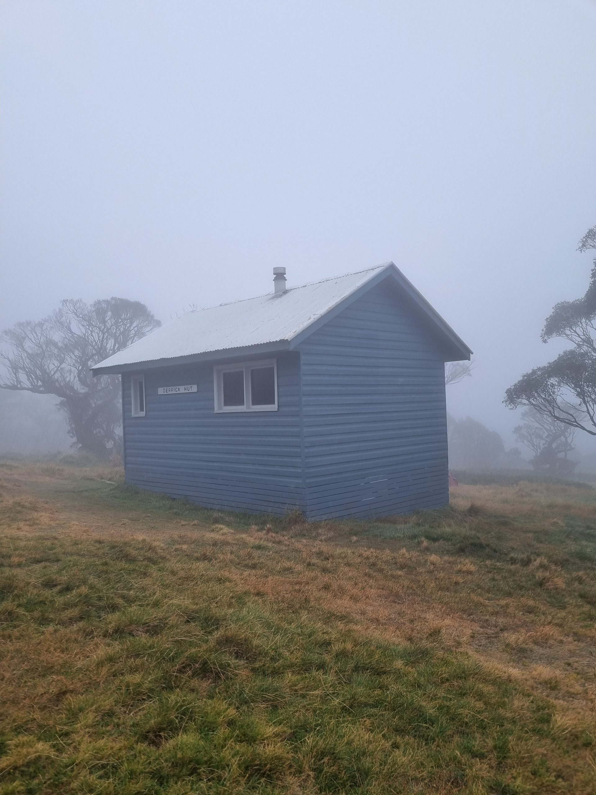 I popped into Derrick Hut, where a crew of guys were packing up, then ascended further with visibility reducing to around 10 metres at over 1800m elevation.