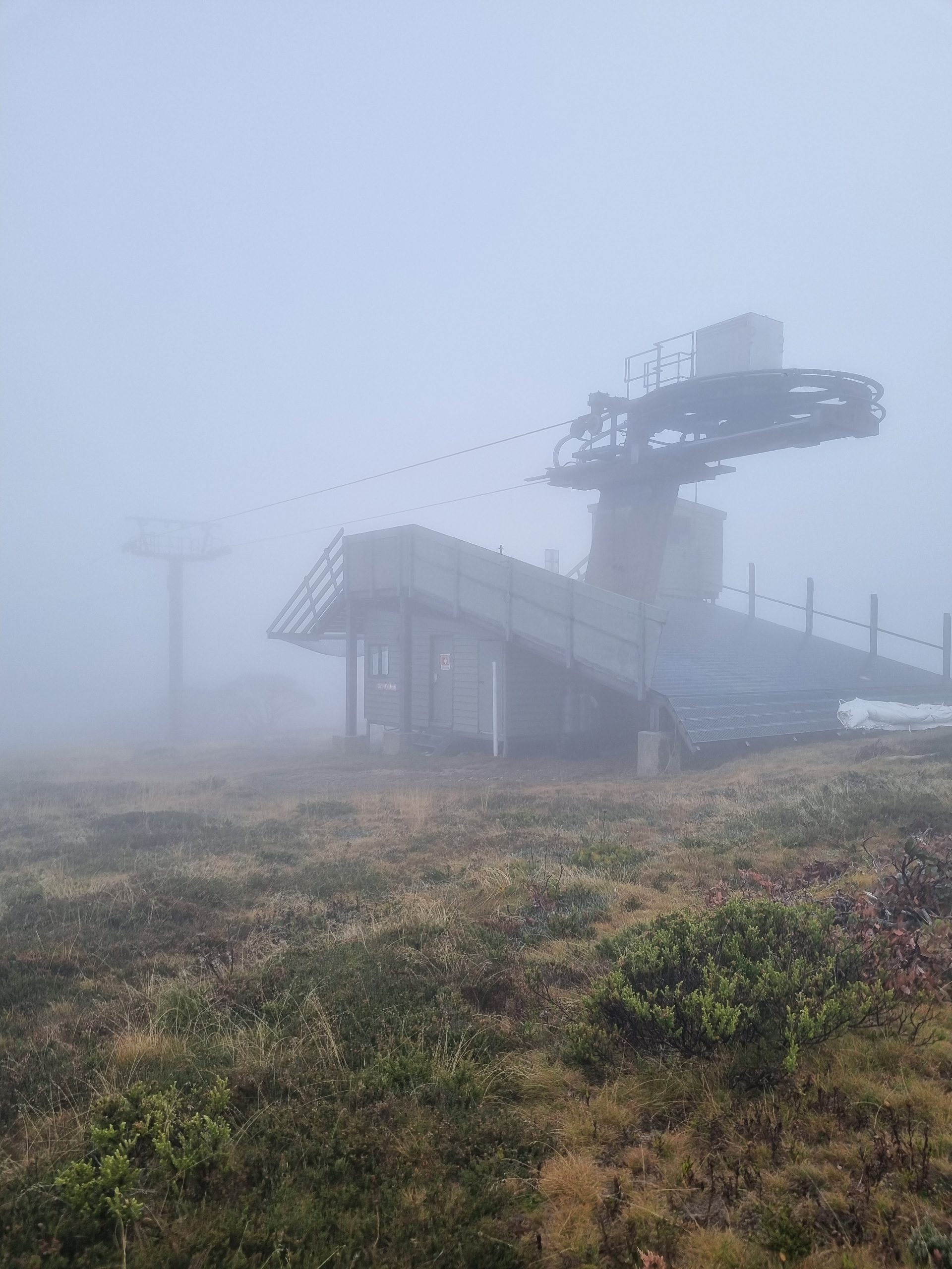 I followed a 4WD track past giant ski lifts, which appeared out of nowhere, due to a thick fog surrounding me and engulfing views at every angle.