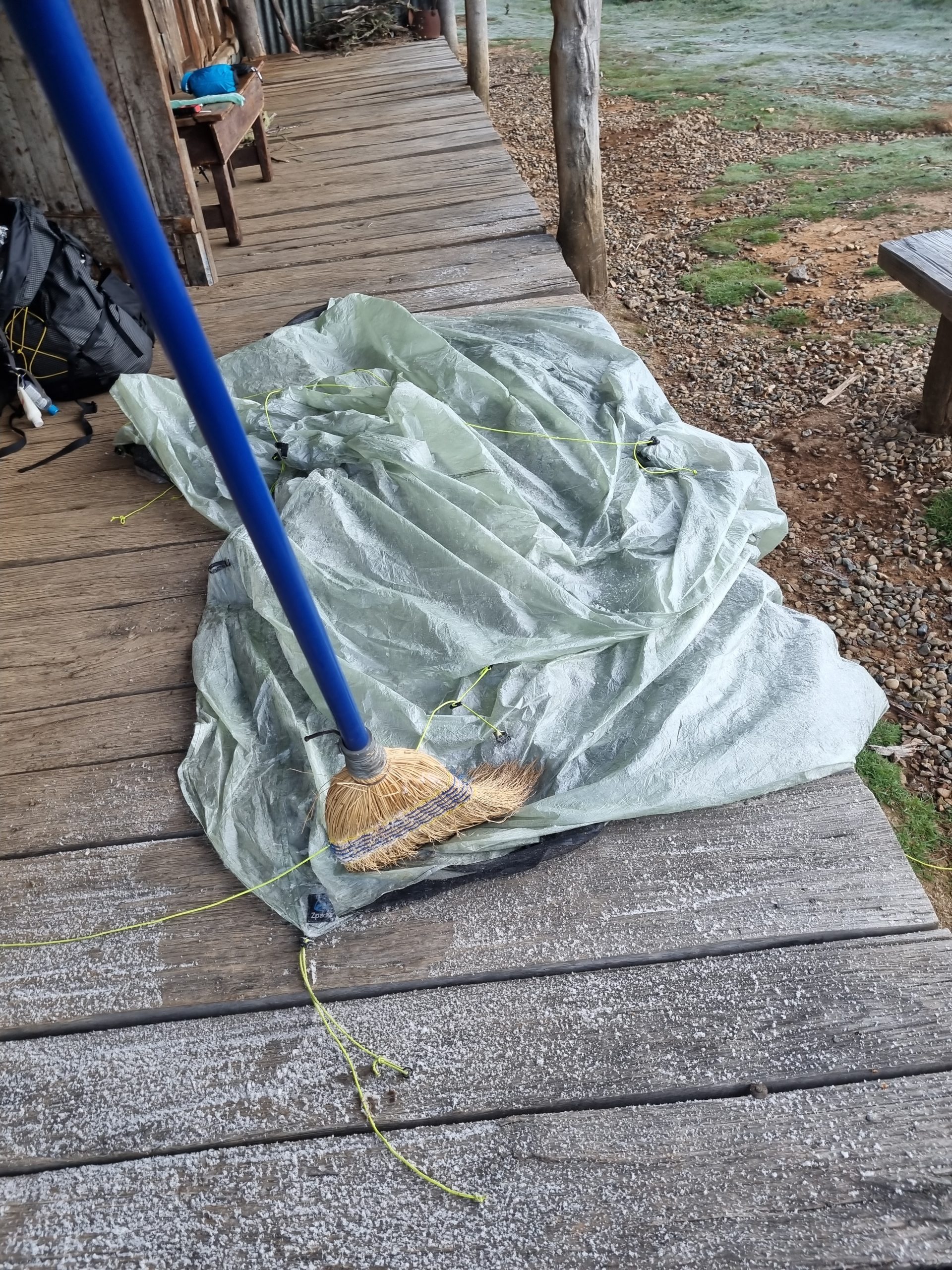 I spent the morning attempting to brush the layer of ice off my tent, dry my damp sleeping bag on a makeshift clothesline and pack my bag with frozen fingers.