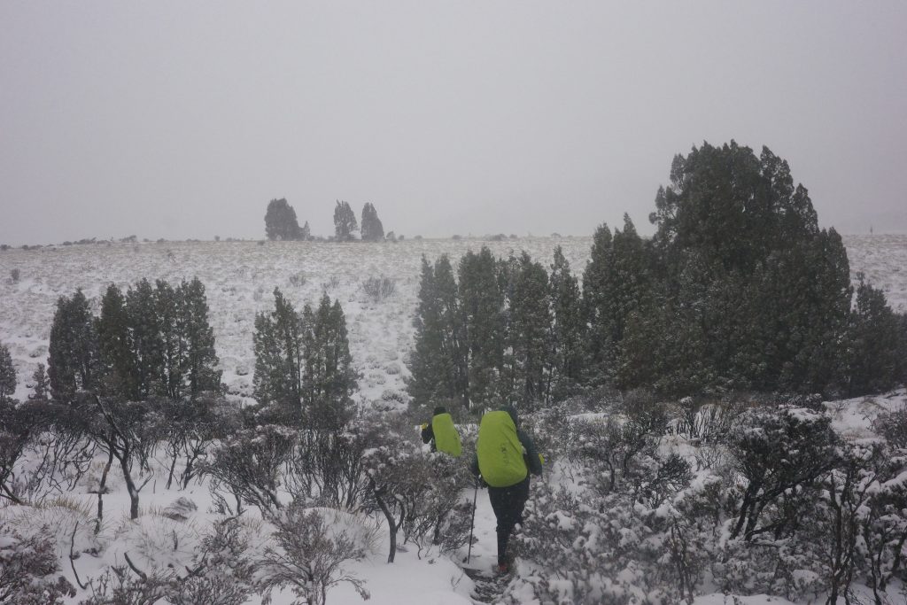 We woke to fresh snow, frozen taps and fierce winds, tackling our biggest day yet as we crossed wild plains and forests to New Pelion Hut.