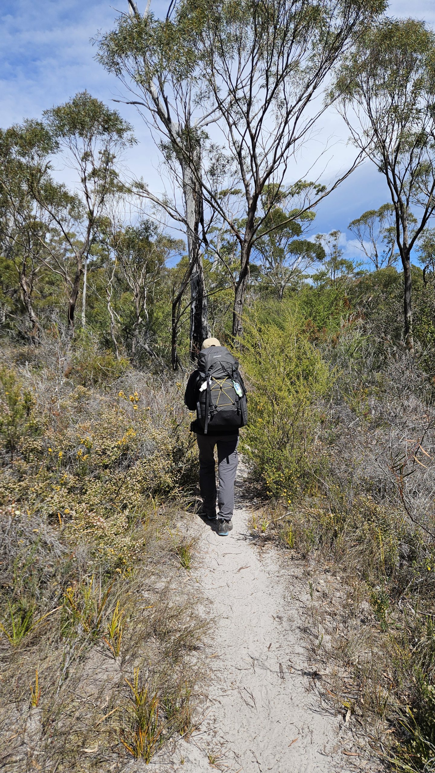 Within a kilometre or so, glimpses of coastline flickered through the scrub to our right, while the granite Hazards rose sharply to our left — bold, rugged and impossible to ignore.