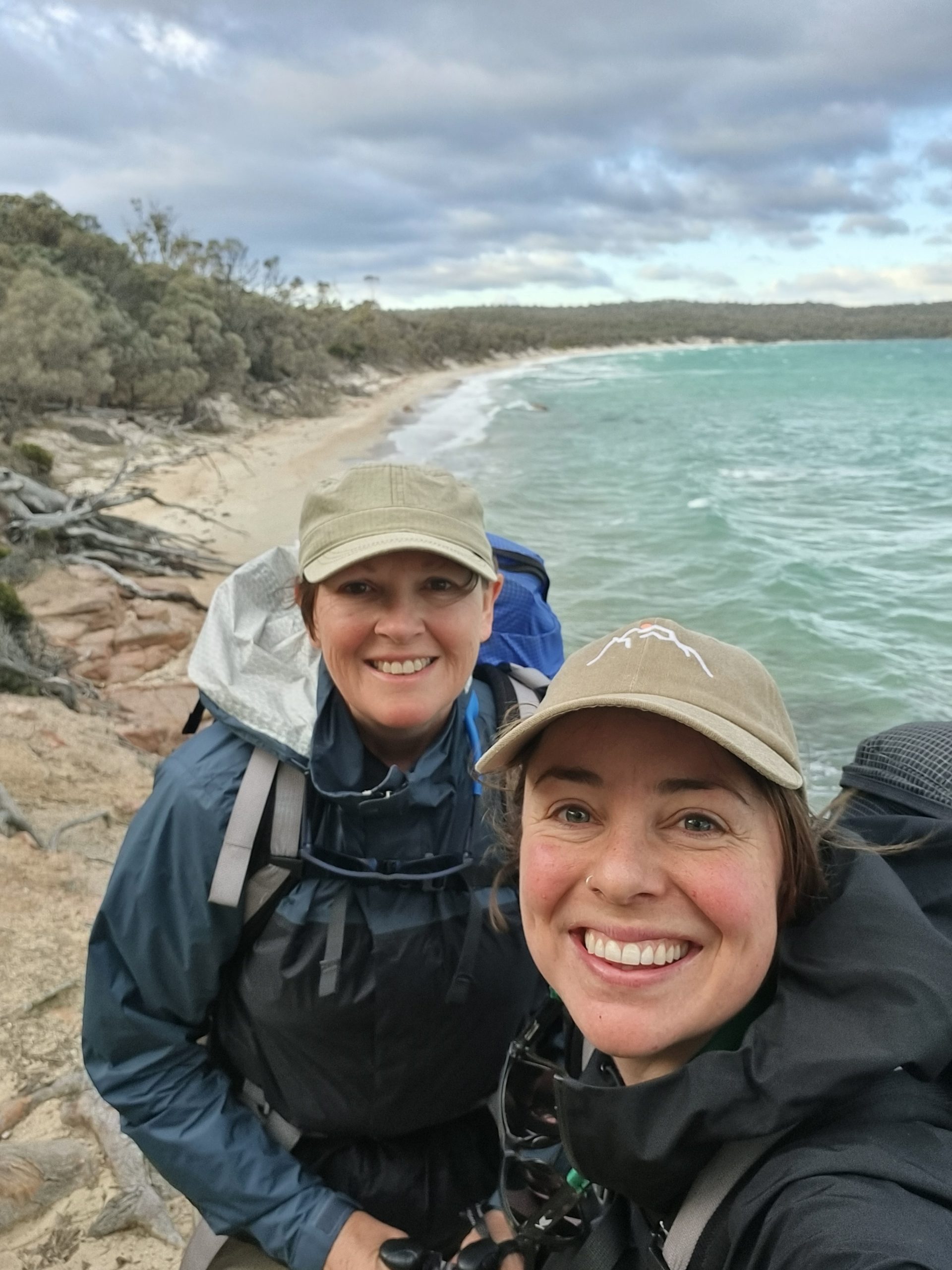 Day 2 on the Freycinet Circuit: steep climbs, gnarly scrambles, Mount Freycinet summit views, turquoise bays, wild winds, and spring blooms.