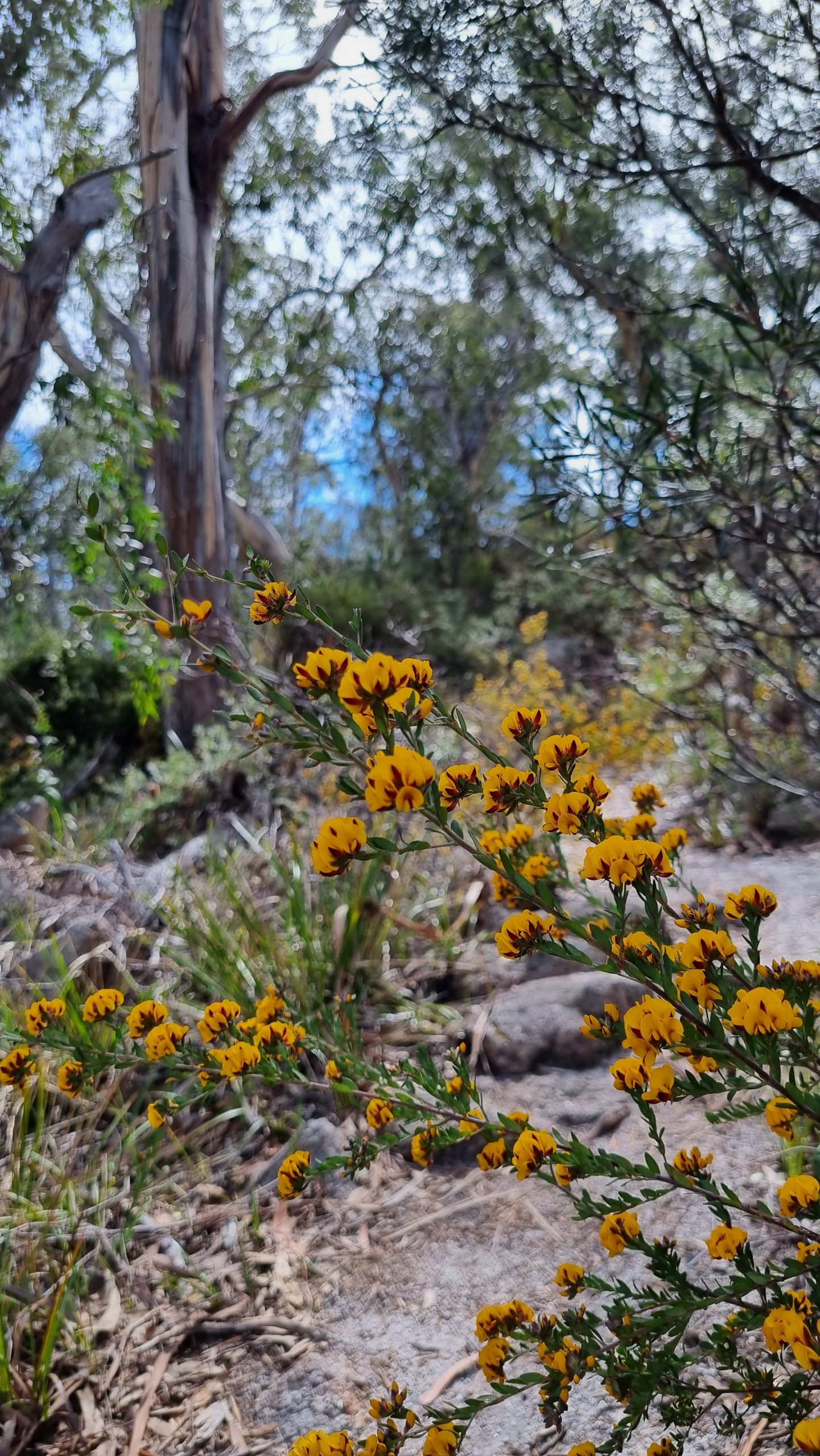 After a short lunch break in a sheltered eucalypt forest, we began a gradual descent toward the white shores of Wineglass Bay, passing bushes dotted with yellow flowers.