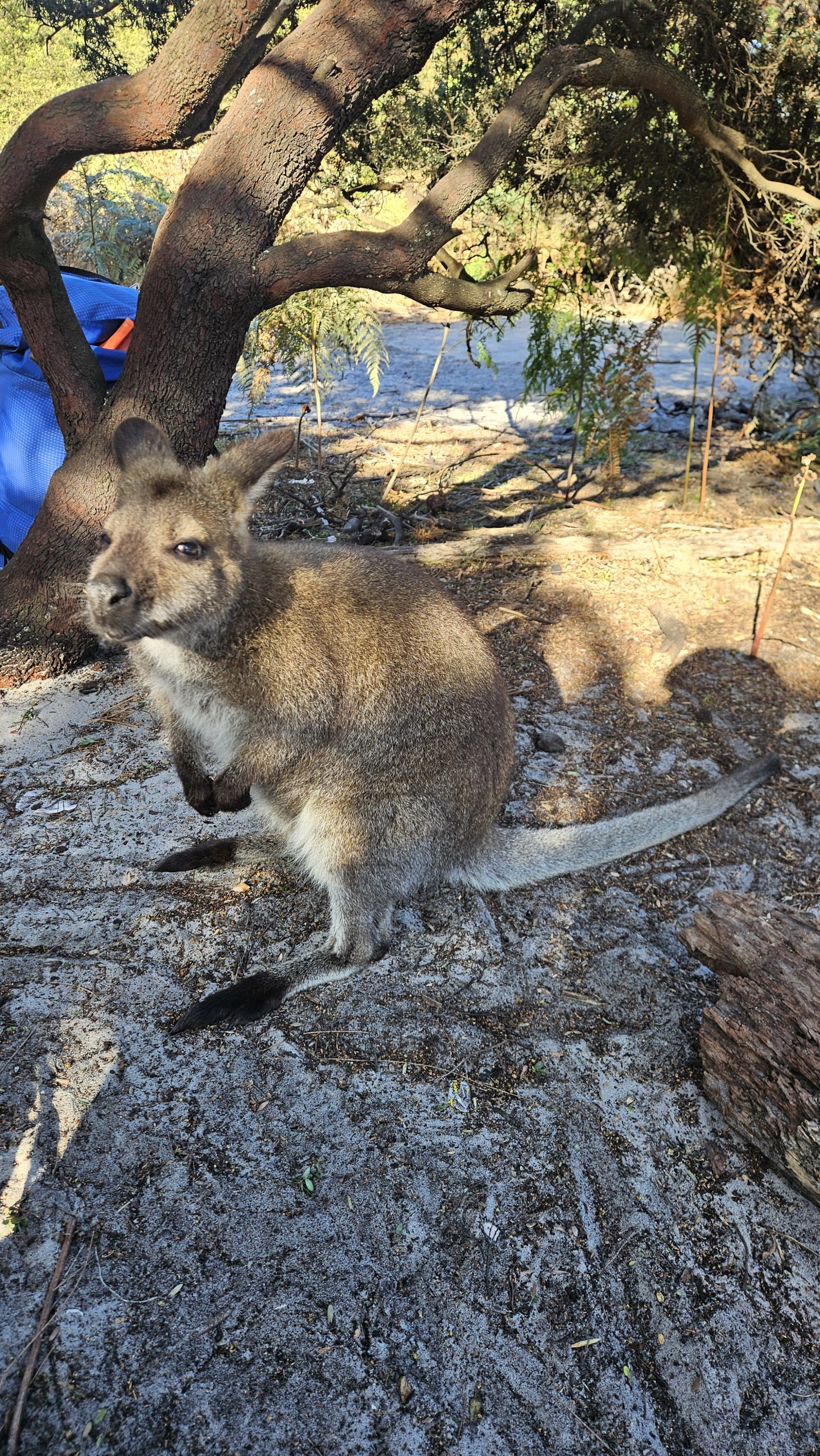 Breakfast was shared with kangaroos — almost literally. Jane got into a tug-of-war over a bag of scroggin, much to the roo’s delight.