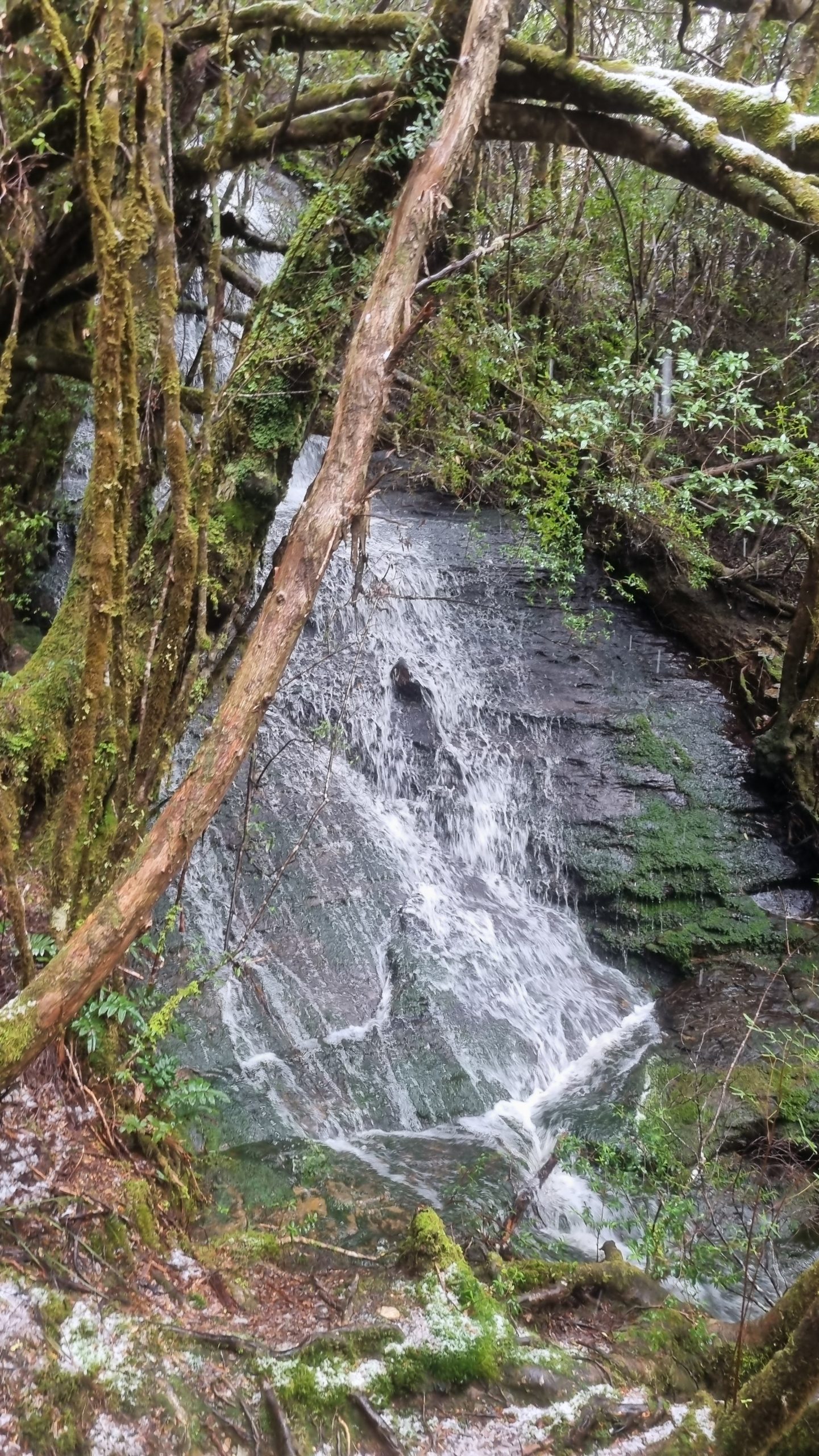 After heading back out onto the plain where the winds remained fierce and snow continued to blast through the sky, the trail lowered in elevation to around 600m and we entered a damp rainforest where we walked along an endless stream.