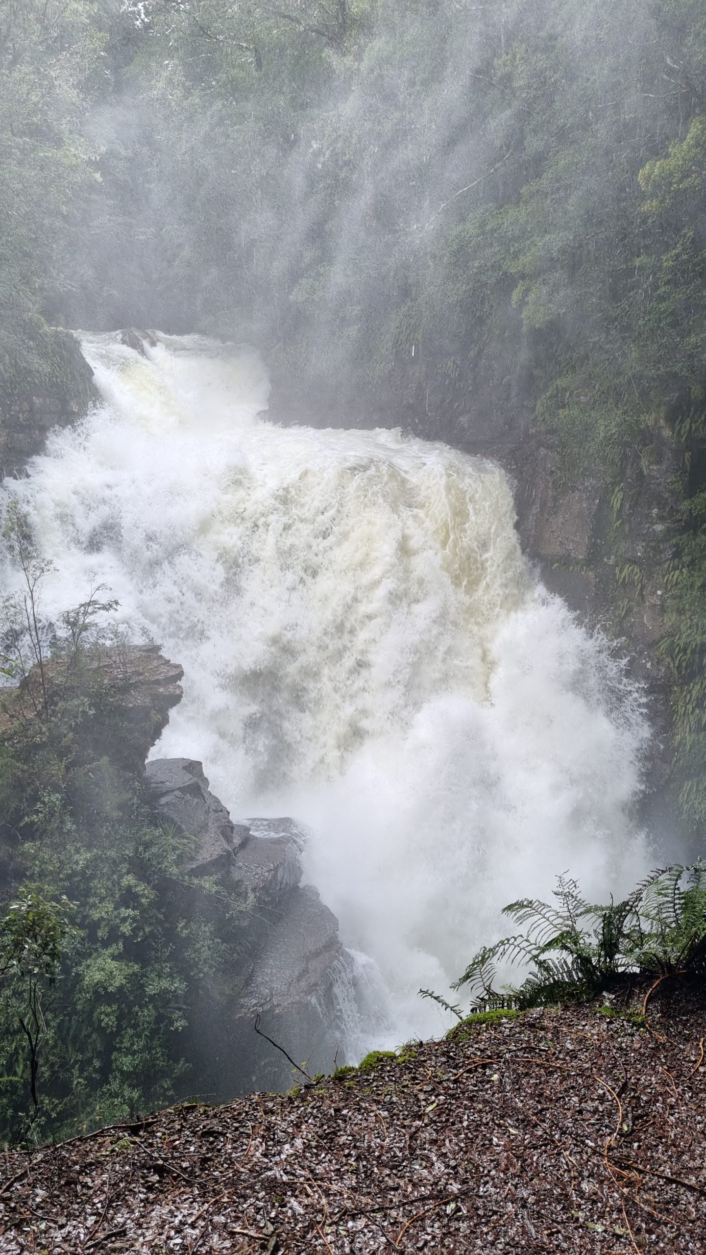 Both waterfalls raged, sending water plummeting into the waterway with incredible force – so much so that it rebounded upwards, sending water spraying through the sky.