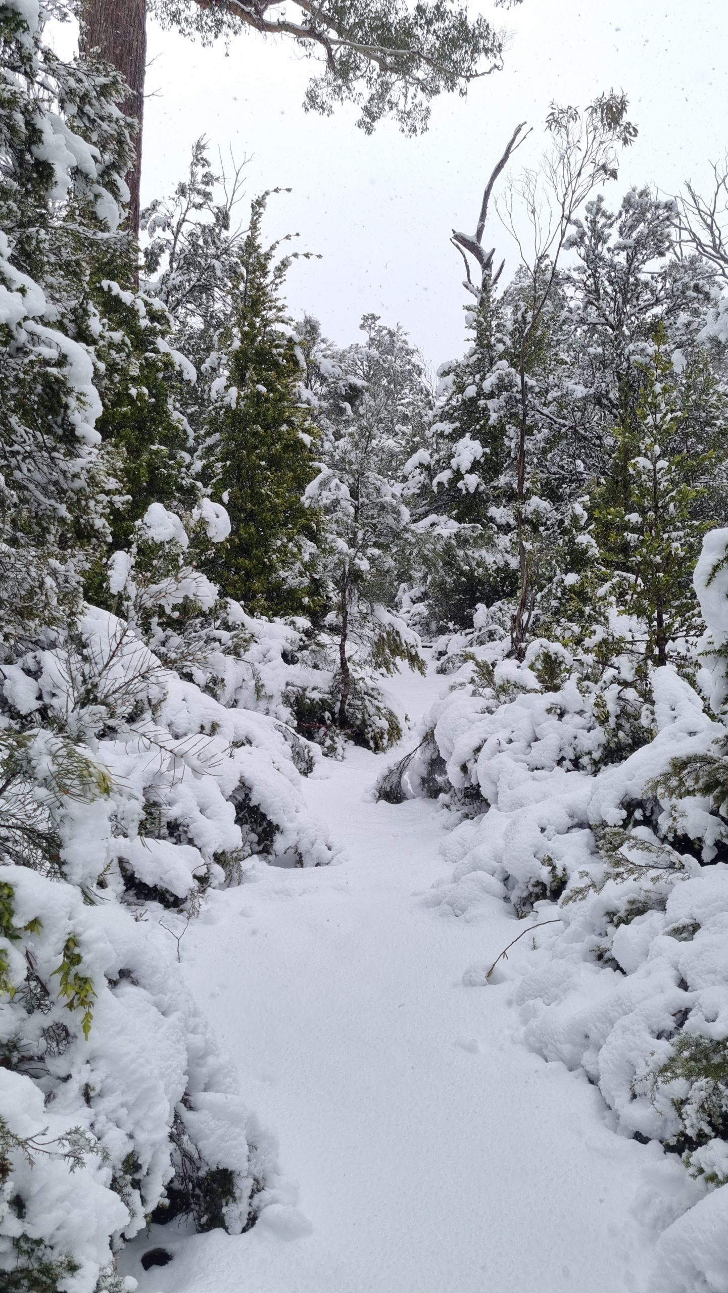 It was a really tough slog, pushing our way through dense overhanging vegetation, getting coated in snow as we brushed past, trudging through 30cm high snow, and eventually getting wet to the core.