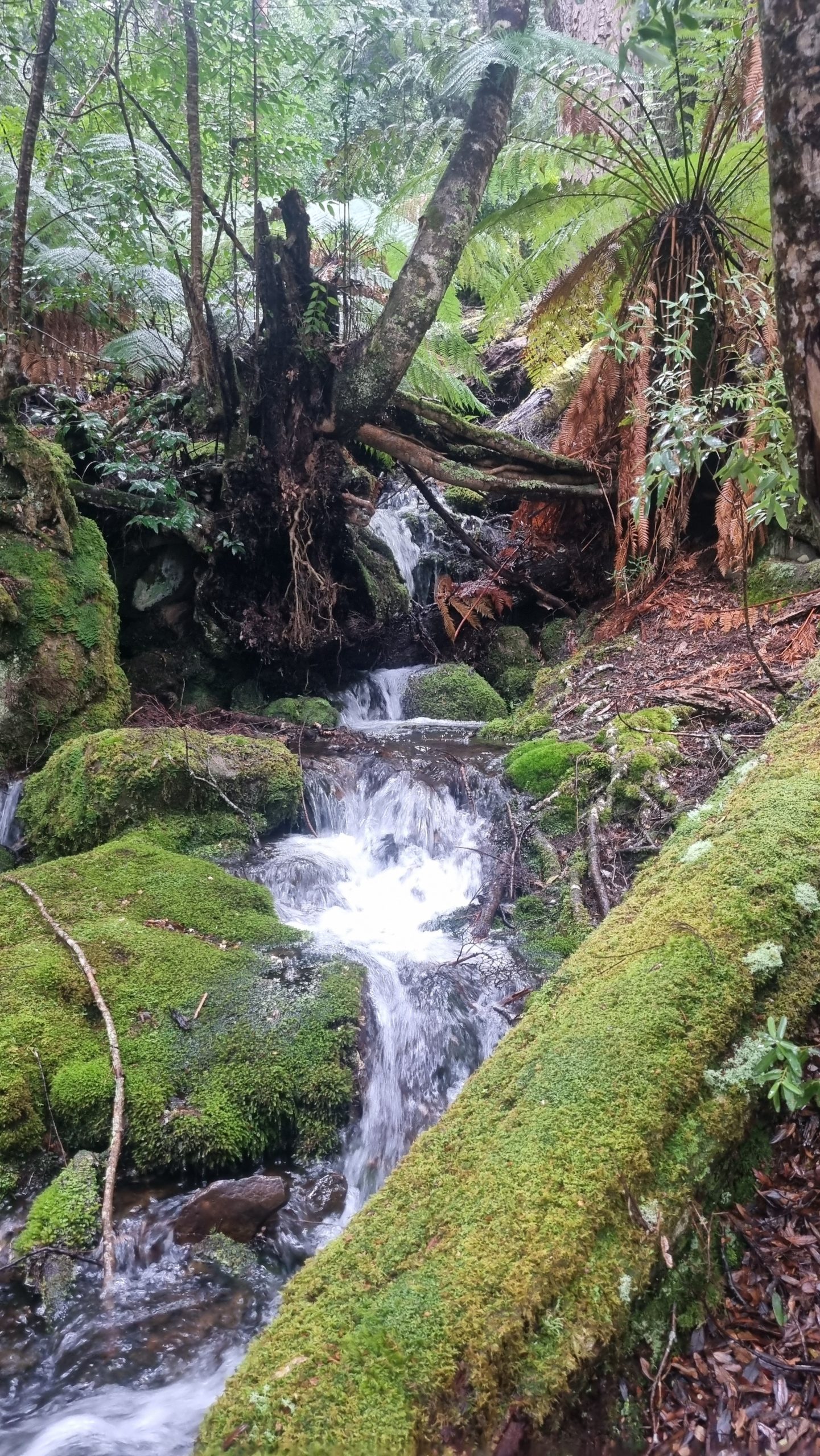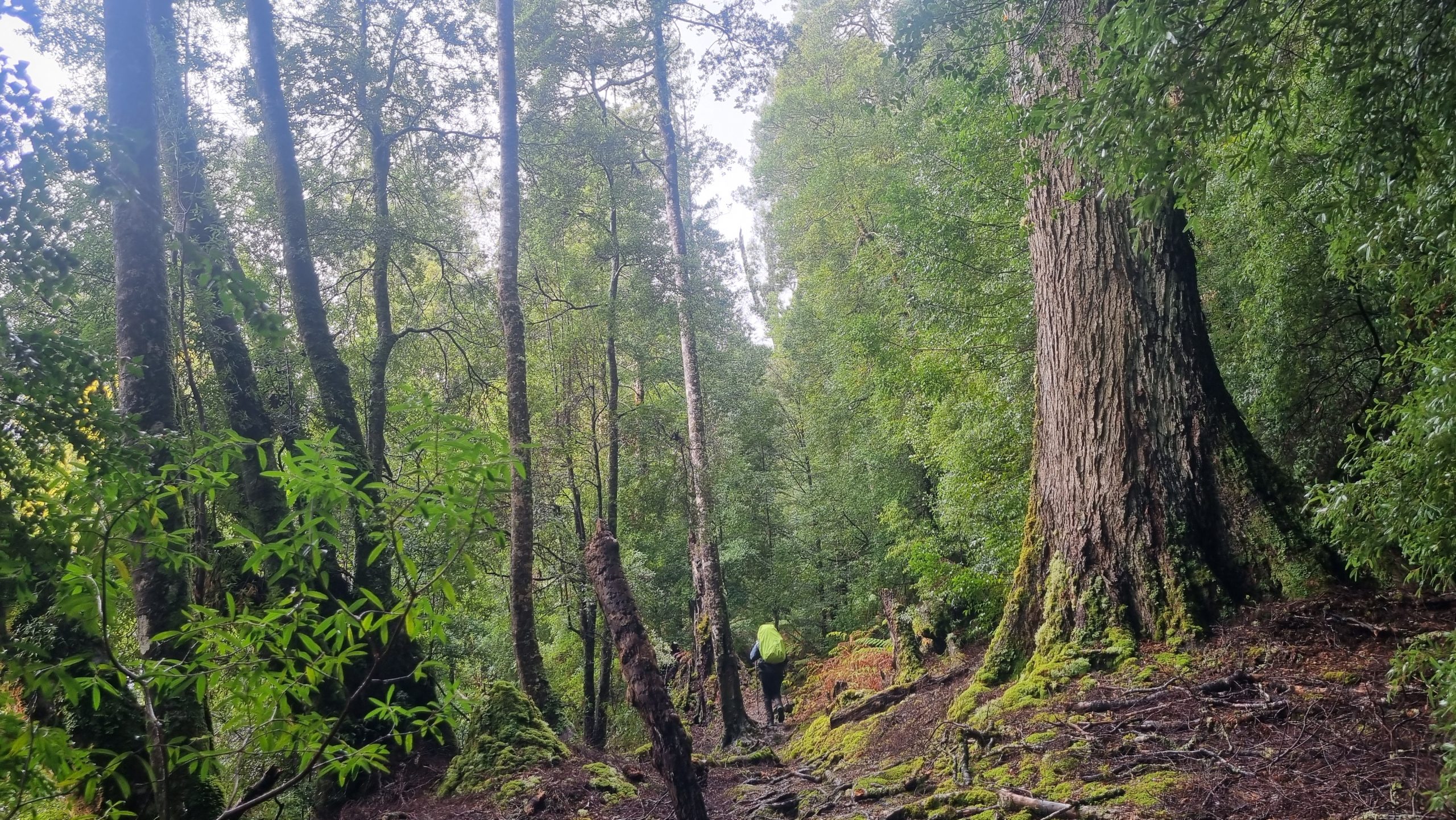 With rain, hail, and snow forecast, we donned all our wet-weather gear and followed the track deep into ancient forest, where little waterfalls gushed and massive trees lay strewn across the path.